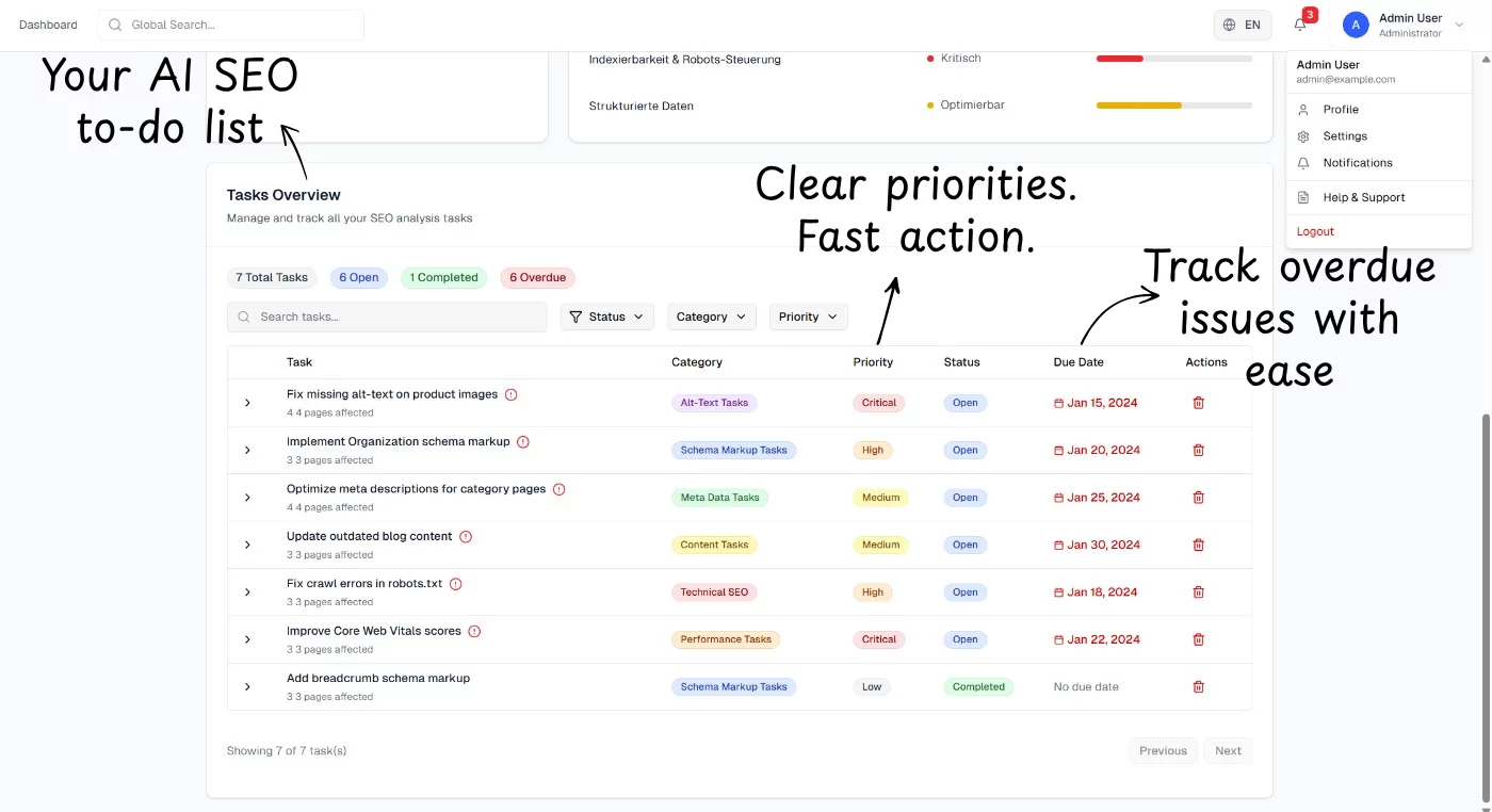 Turn insights into action. From technical fixes to content updates – every task is prioritized and explained, so you know exactly where to start.
