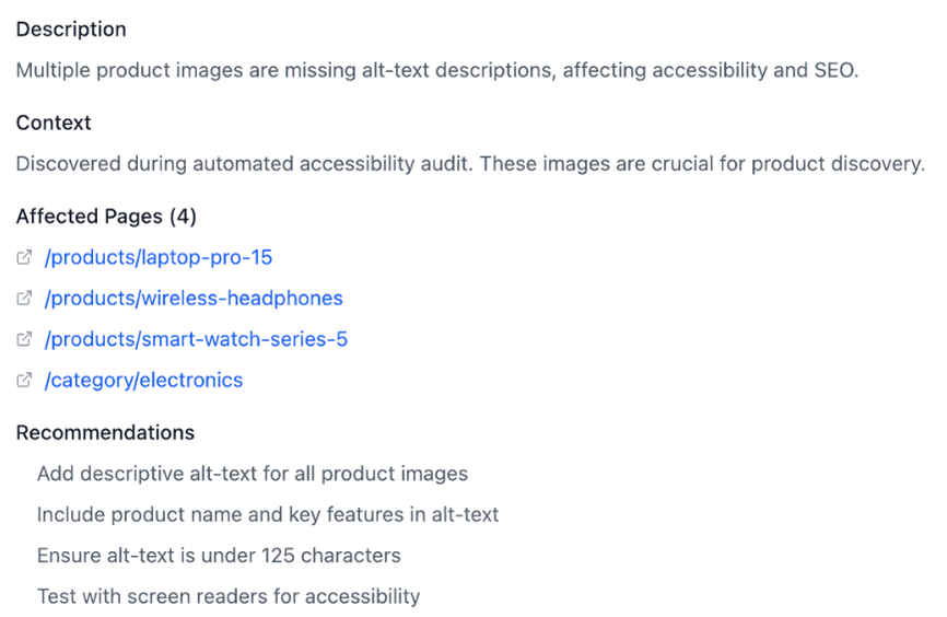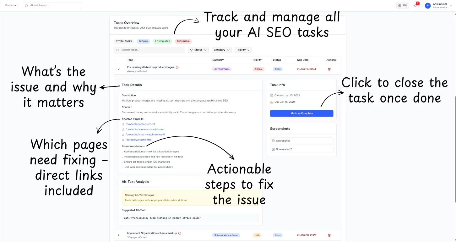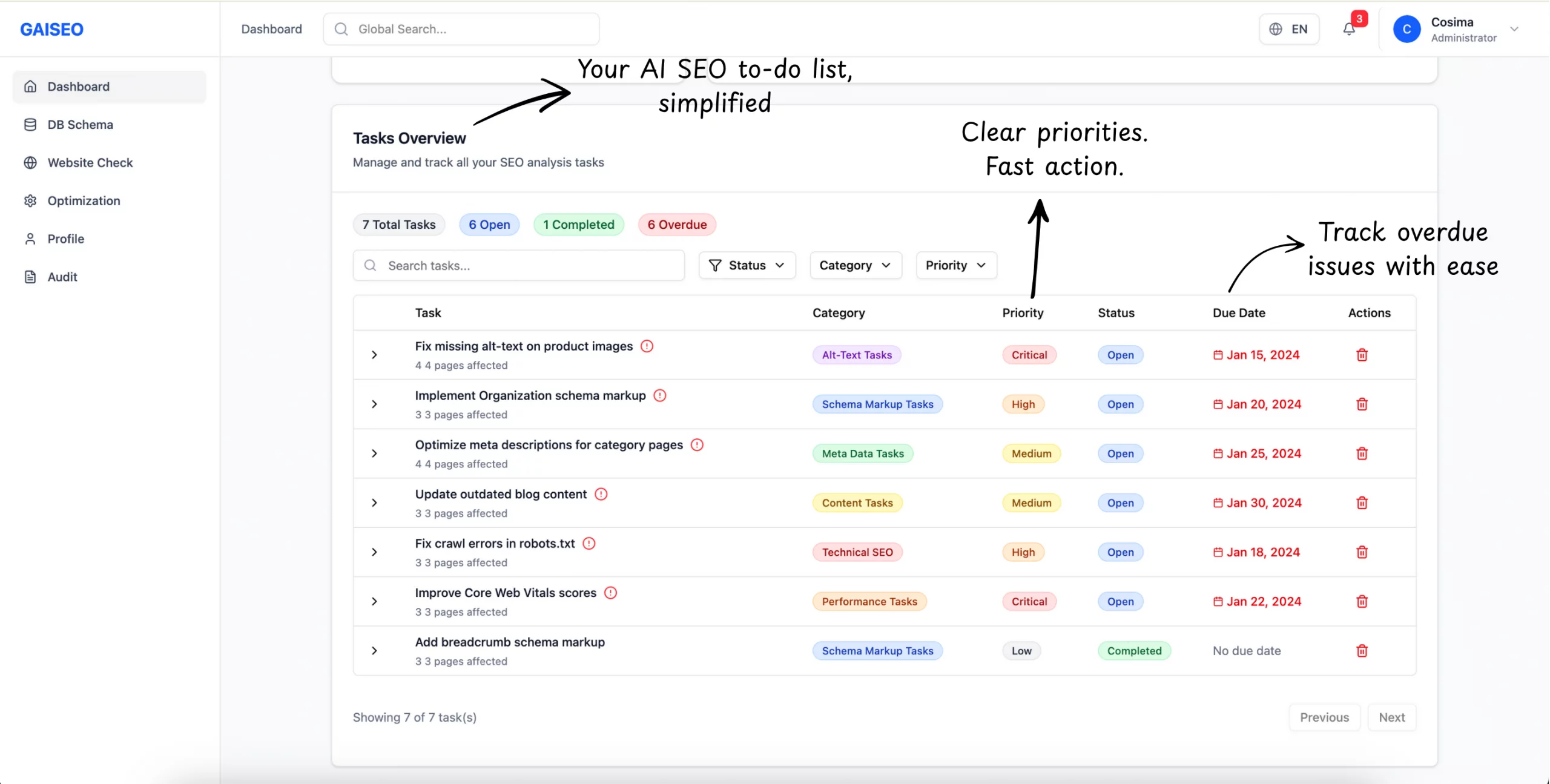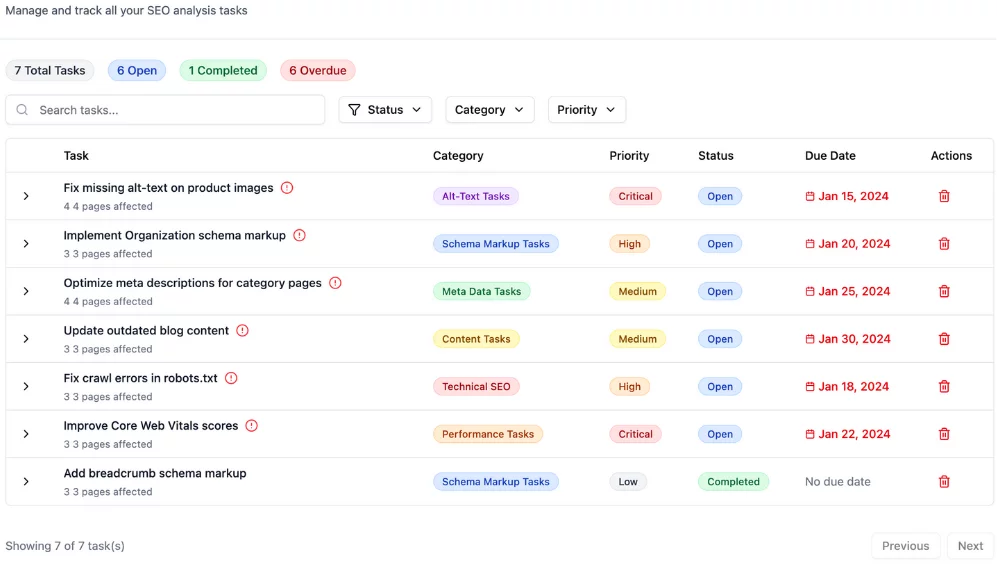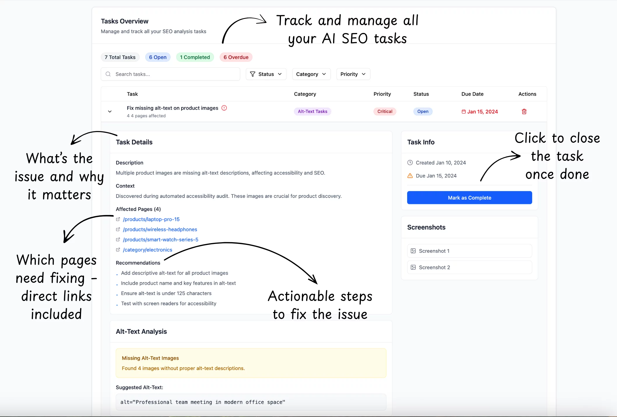 Get a clear breakdown of each optimization task – from missing metadata to weak internal links.