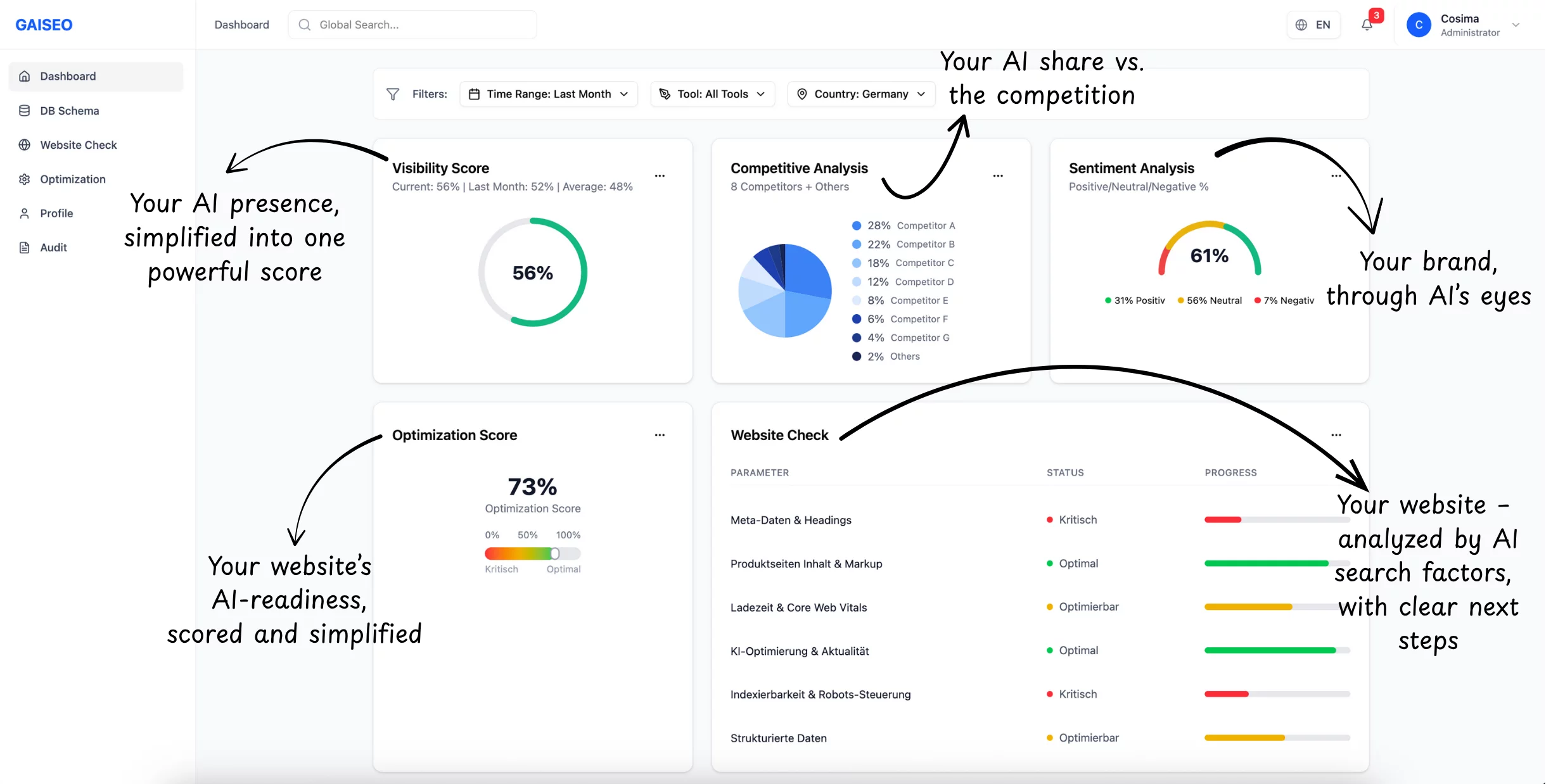 “We use GAISEO to track our AI visibility monthly. The competitor insights and sentiment analysis are spot on – and super actionable.”