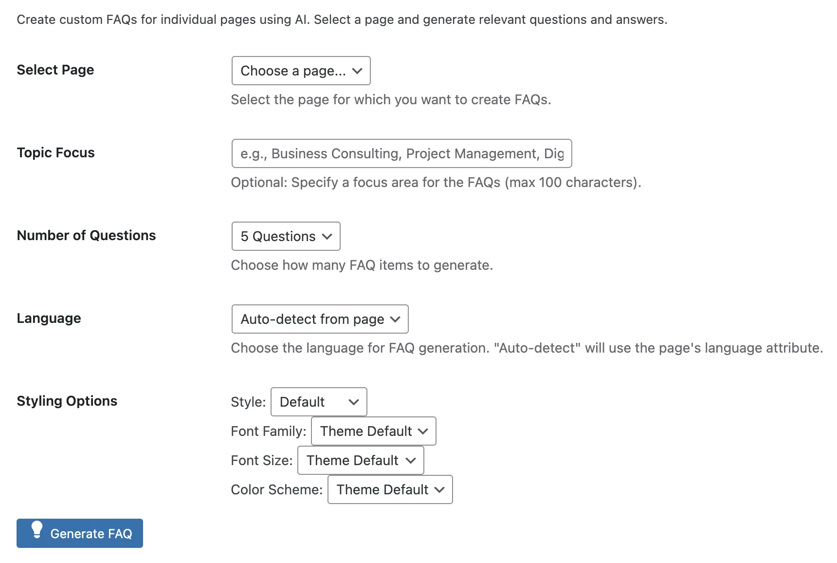 Select a page, define your topic, and create LLM-formatted, multilingual FAQs tailored to your content