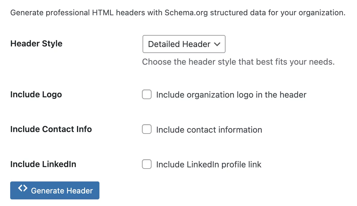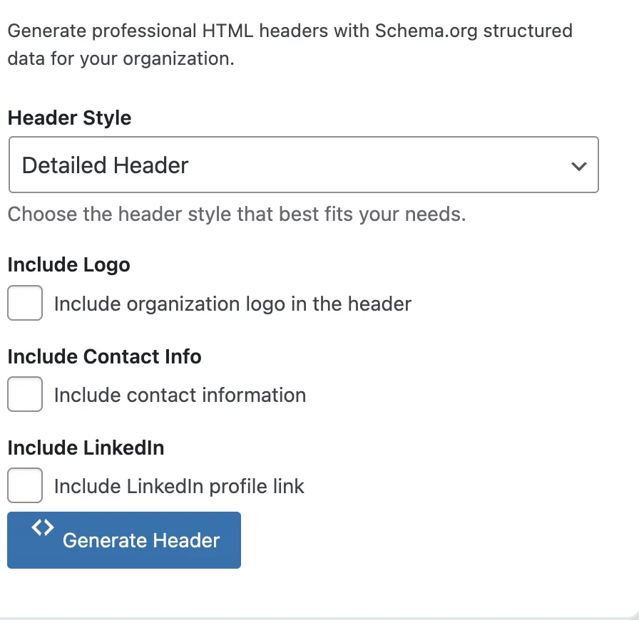 Easily generate headers including logo, contact info, and LinkedIn—ready to boost your AI and search engine visibility