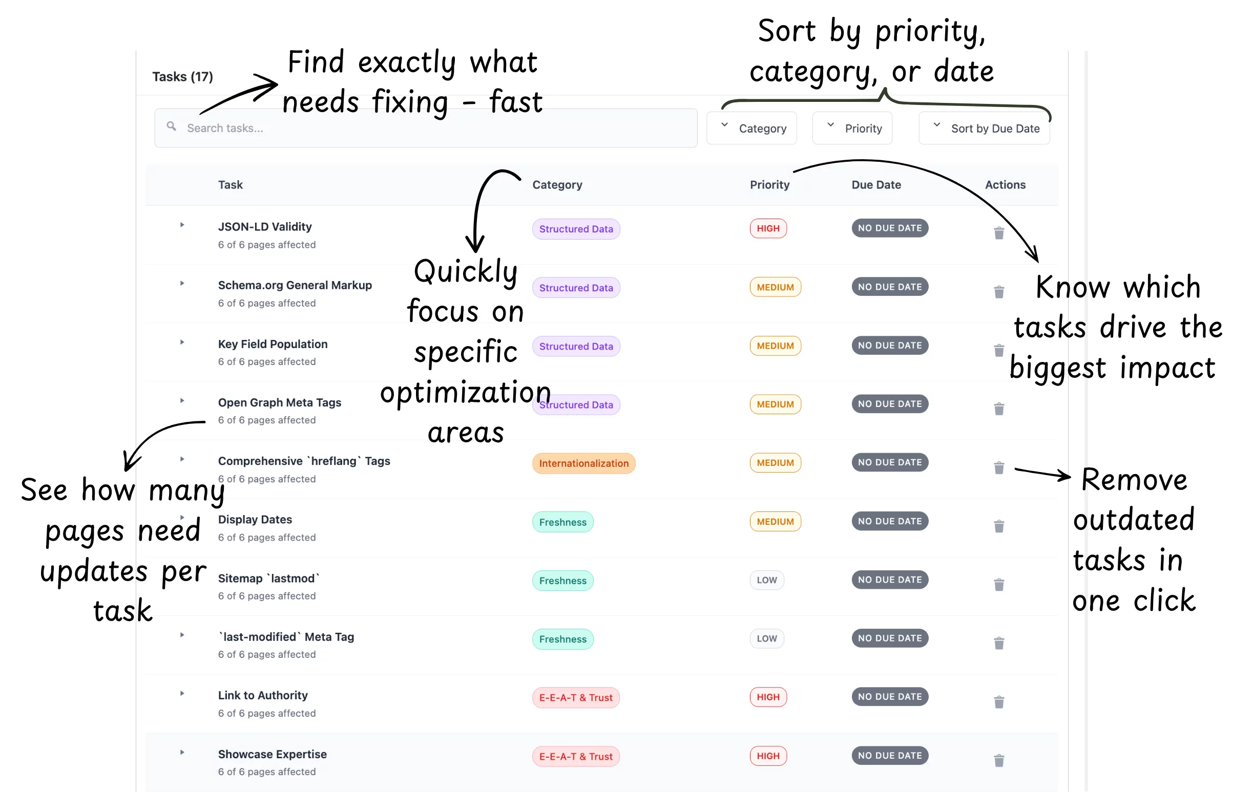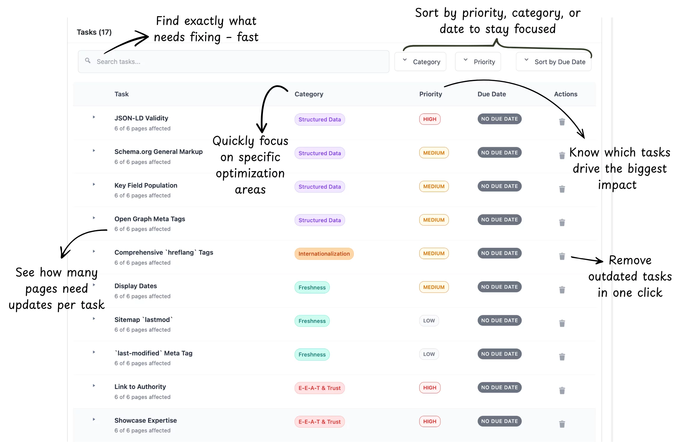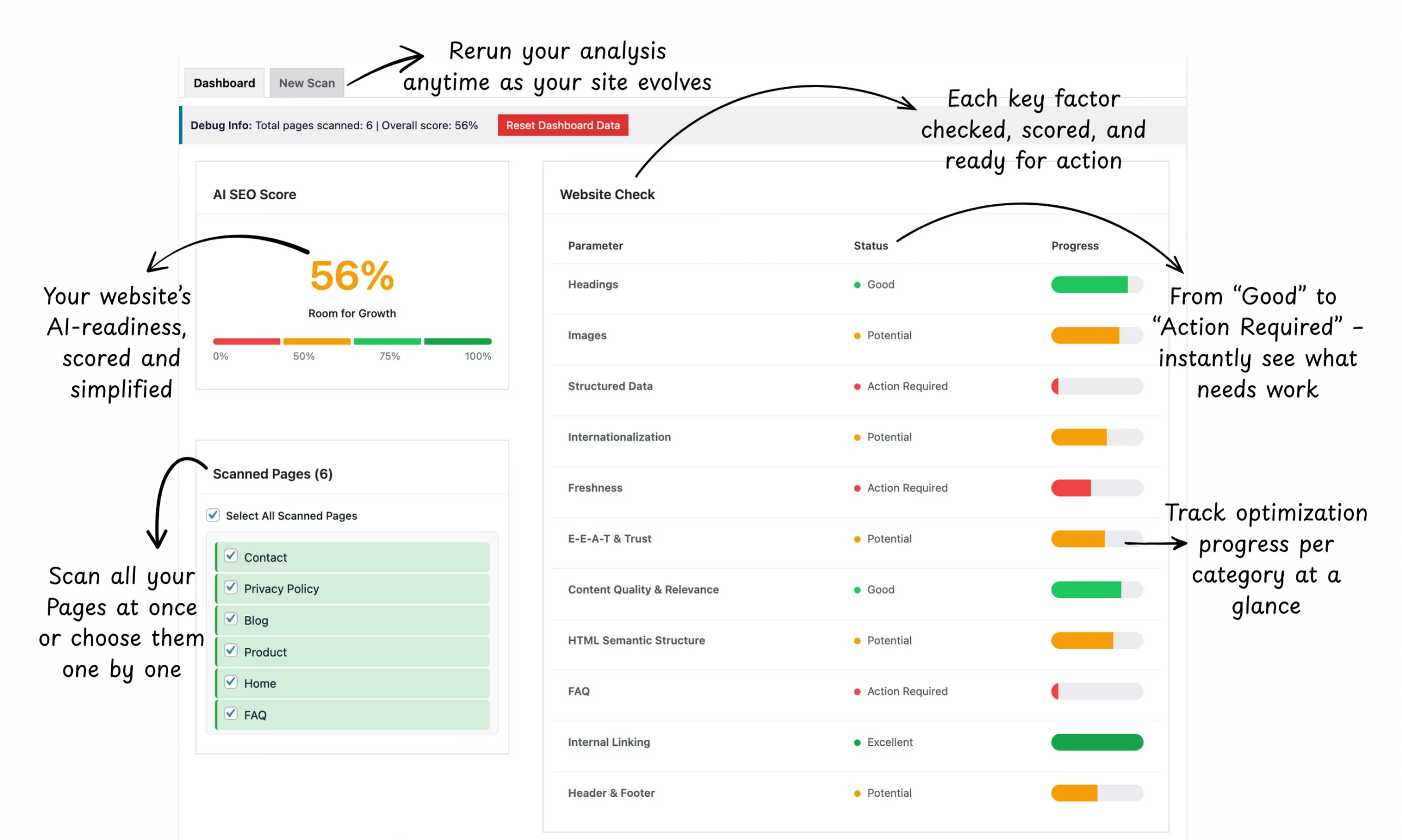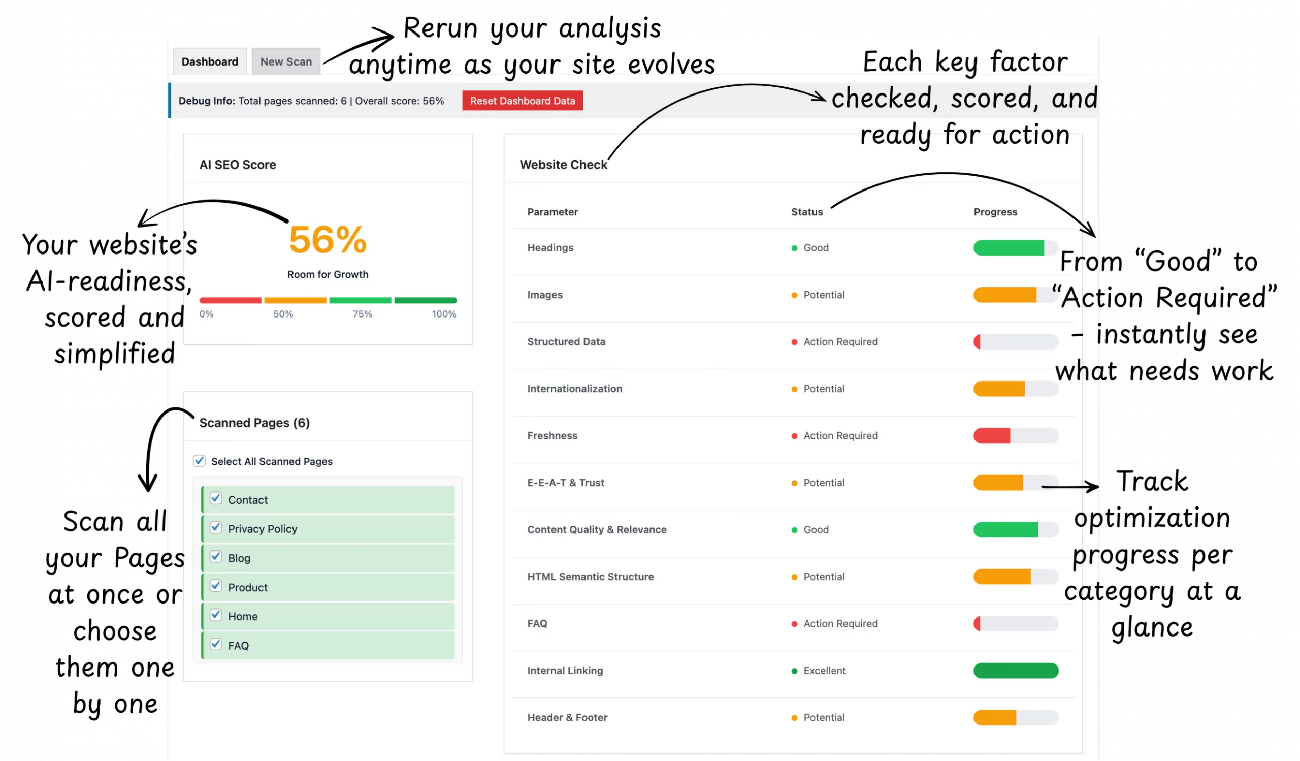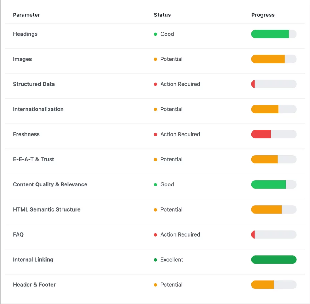 Absolutely. The Website Check scans your site’s most important AI-SEO parameters, assigns status colors, and lists actionable tasks so you know what to fix first.