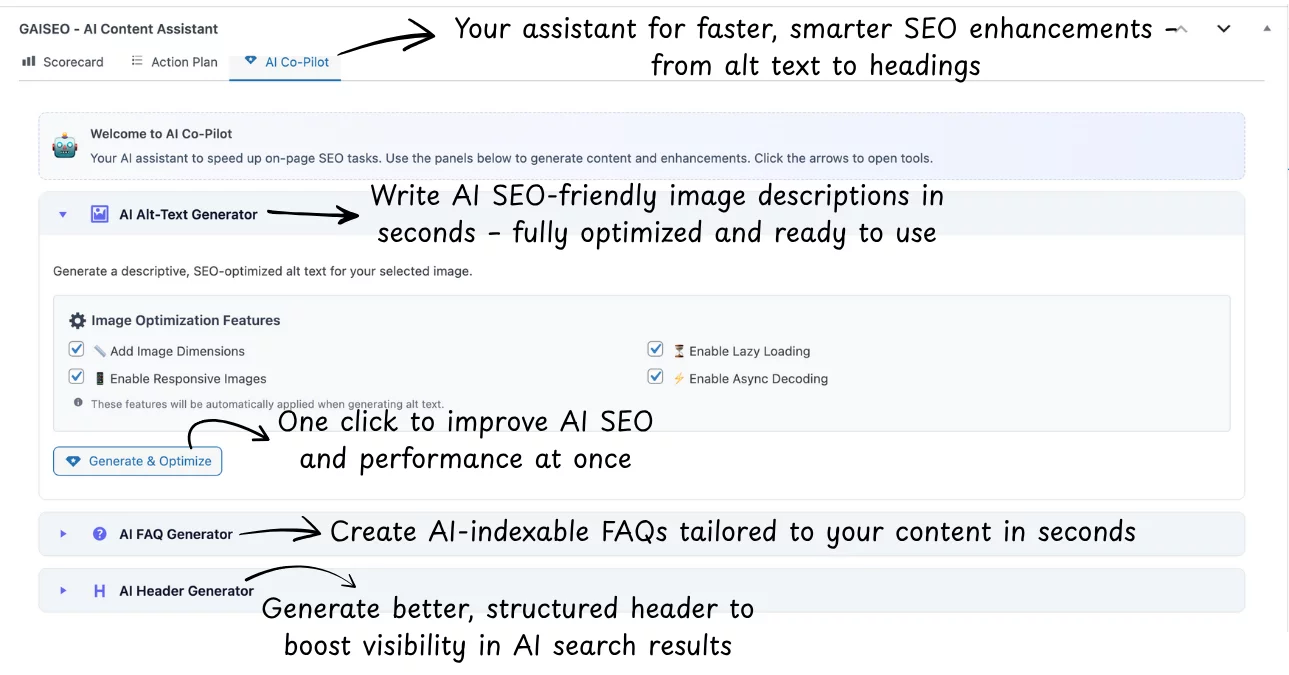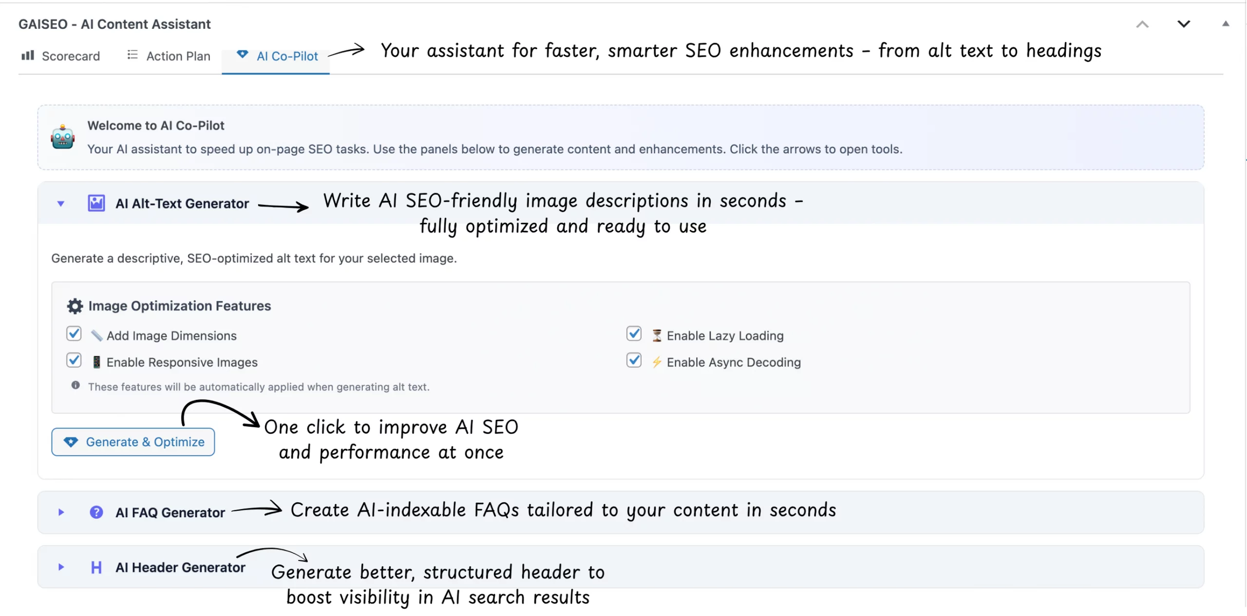 Work smarter, not harder. Our AI Co-Pilot works inside your editor to instantly generate optimized alt texts, FAQs, and more while you write.