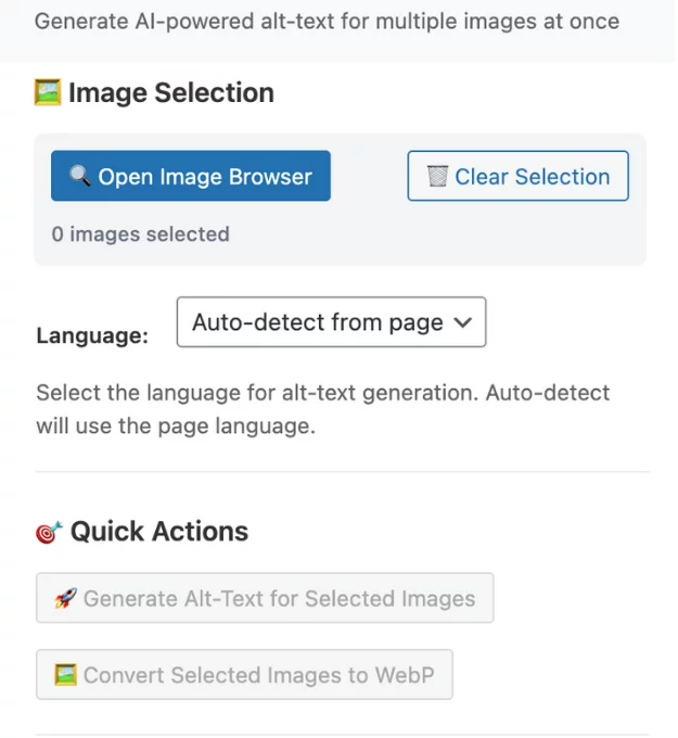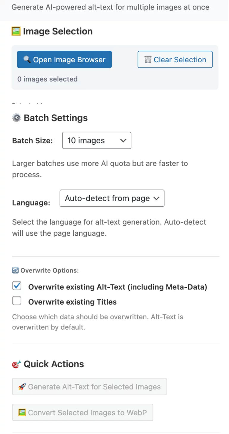 Create Alt Texts in Bulk and transform images into WebP format with one click